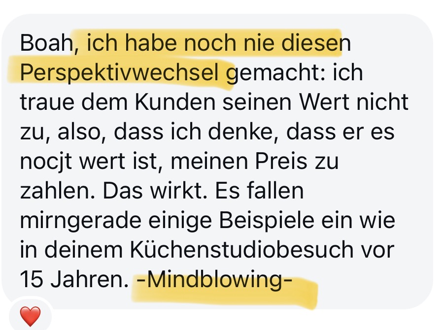 ...du deinen Preis mit einem guten Gefühl anheben willst und den Preis ganz selbstverständlich kommunizieren kannst. Ohne das Gefühl, dich dafür rechtfertigen zu müssen. "