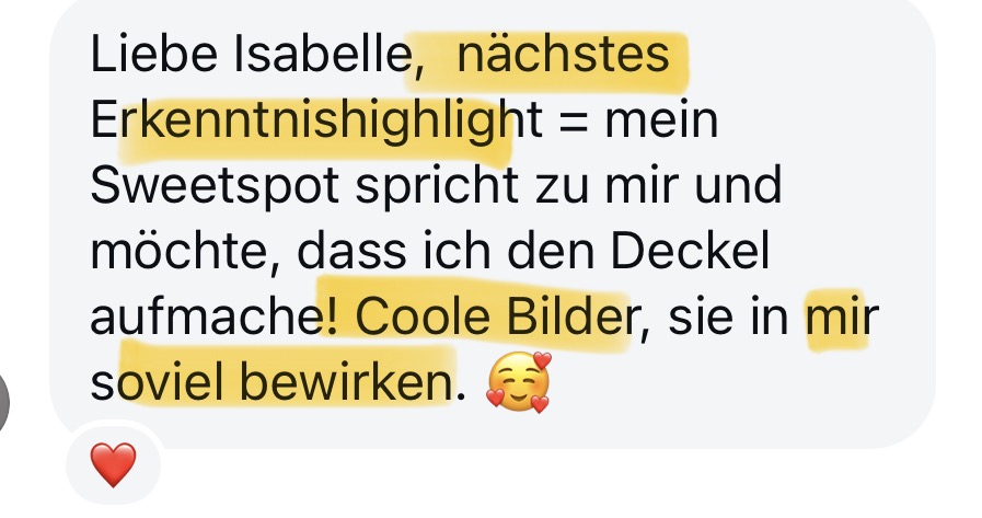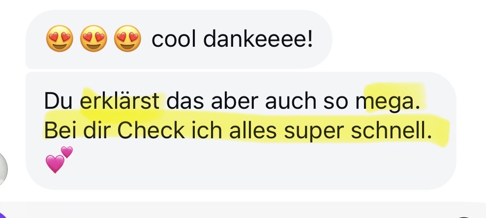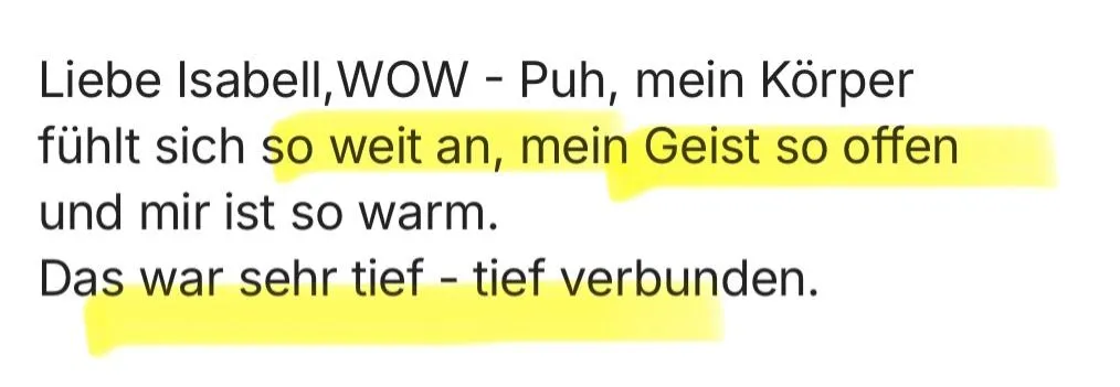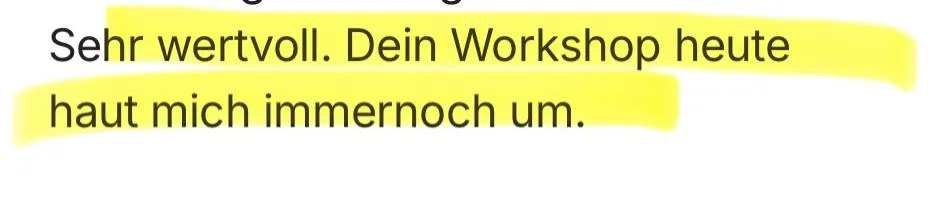 "Ich habe sehr viel gelernt, sehr viel mitgenommen. Was ich besonders gut finde, ist wirklich, dass du direkt einsteigst in die Übungen. Dass ich direkt dran bin und sofort was damit mache. Das ist super hilfreich, weil man dann ins Tun kommt. Da löst sich so eine innere Blockade. Ich habe mehr bekommen, als ich erwartet habe.