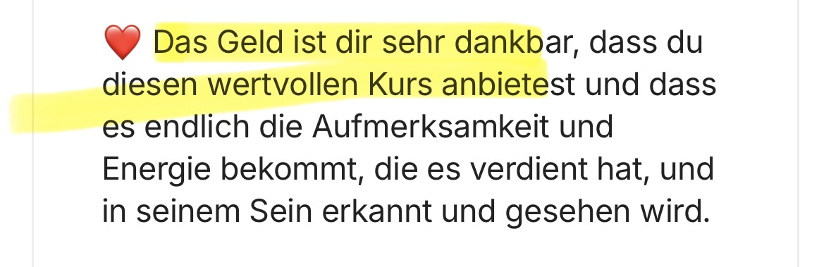 Du bekommst energetische Impulse, die deine Preisenergie auf Zellebene wachrütteln. Damit dein System „Ja“ zu deinem neuen Preis sagt, bevor dein Kopf überhaupt darüber nachdenken kann.
