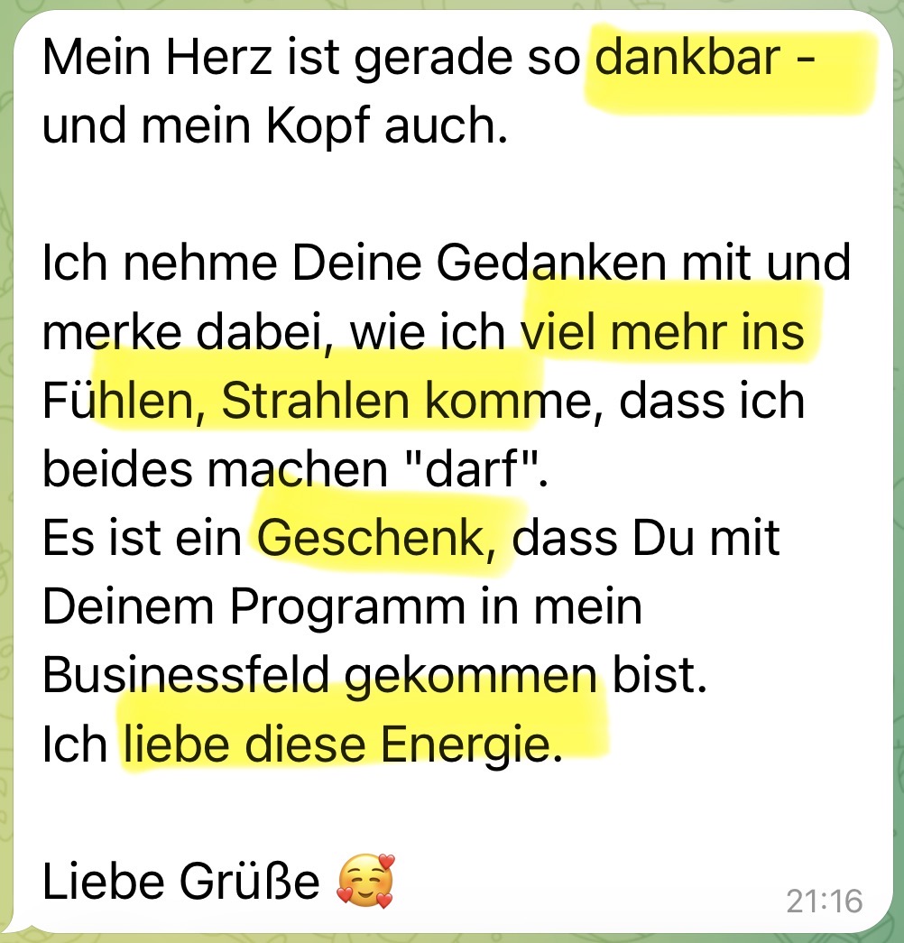 "Dass Programm mit dir hat mir gut gefallen. Ich habe das ausprobiert. Es funktioniert. Ich werde es nicht mehr vergessen und immer wieder anwenden.